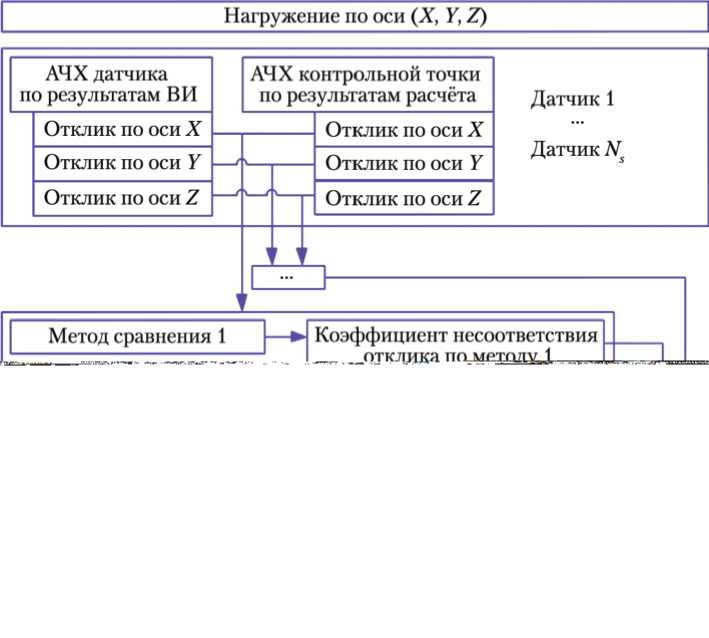 В процессе каждой итерации алгоритмы сравнивают три отклика с каждого физического ВиП с откликами в контрольных точках КЭМ и определяют коэффициенты несоответствия откликов по каждому из датчиков, а также общий коэффициент несоответствия, который служит оценочным критерием процесса оптимизации в pSeven . На рис. 2 показана укрупнённая схема определения общего коэффициента несоответствия.