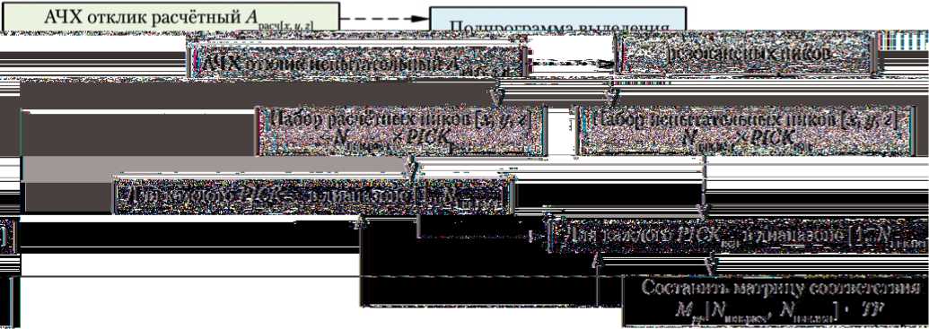 Рис. 4. Схема вычисления коэффициента несоответствия по методу поиска резонансных пиков: АЧХ — амплитудно-частотная характеристика; A расч[ x, y, z ] , A исп[ x, y, z ] — расчётная и испытательная амплитудно-частотные характеристики соответственно; N пик.расч , N пик.исп — количество резонансных пиков (РП) на расчётной и испытательной АЧХ соответственно; PICK расч , PICK исп — наборы информации о расчётном или испытательном РП; Mpp — матрица соответствия расчётных и испытательных РП для текущих А расч[ x, y, z ] и А исп[ x, y, z ] (рисунок создан автором)