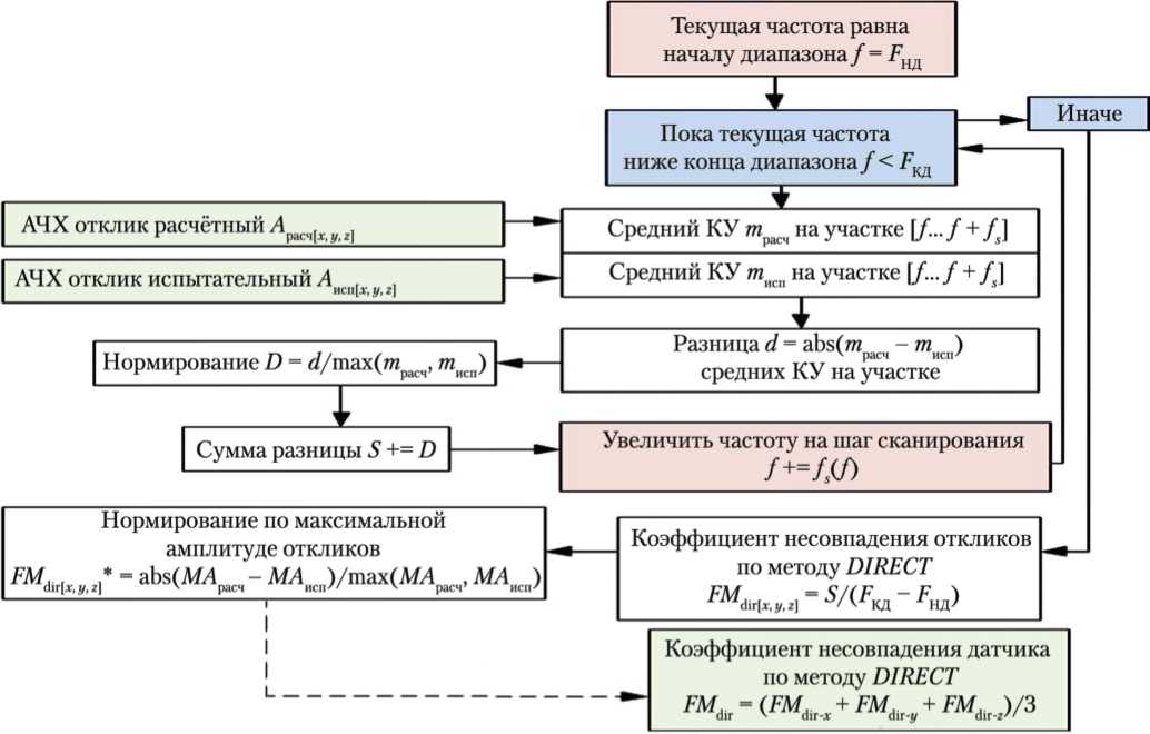 Рис. 6. Схема вычисления коэффициента несоответствия по методу прямого сравнения: АЧХ — амплитудно-частотная характеристика; КУ — коэффициент усиления; F НД , F КД — частота начала и конца диапазона соответственно; f, fs — текущая частота и шаг по частоте соответственно; m расч , m исп — средняя величина КУ на исследуемом участке (шаге); MA расч , MA исп — максимальная величина КУ во всём диапазоне текущего отклика; d, D — величина разницы между расчётными и испытательными средними КУ на участке и их нормированная разница соответственно; S — накопленная сумма нормированной разницы величины средних испытальных и расчётных КУ на участке; FM dir[ x, y, z ] — коэффициент несовпадения текущих расчётных и испытательных откликов; FM dir – общий коэффициент несовпадения по всем трём откликам для метода DIRECT (рисунок создан автором)