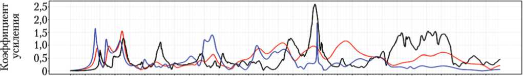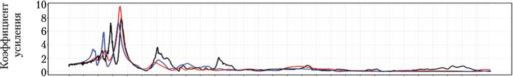 Типовой вид графиков АЧХ (представляющих собой отклики вибрационного датчика) изображён на рис. 3. Здесь и далее по оси абсцисс показана частота в герцах, а по оси ординат — безразмерный коэффициент усиления (КУ). Он представляет собой отношение виброускорения конструкции в контрольной точке в единицах g ко входному виброускорению (в единицах g ), заданному с испытательного стенда или в расчёте. Таким образом, КУ показывает, во сколько раз входное вибрационное воздействие усиливается в определённой точке конструкции. Здесь и далее все графики АЧХ нормированы к единичному (1 g ) входному воздействию.