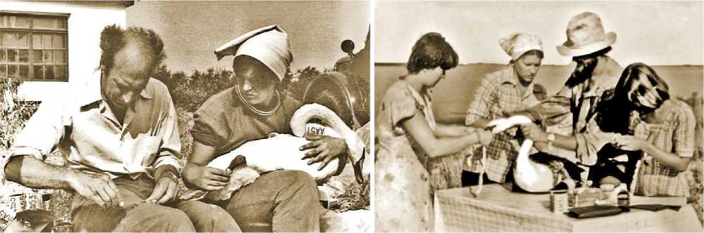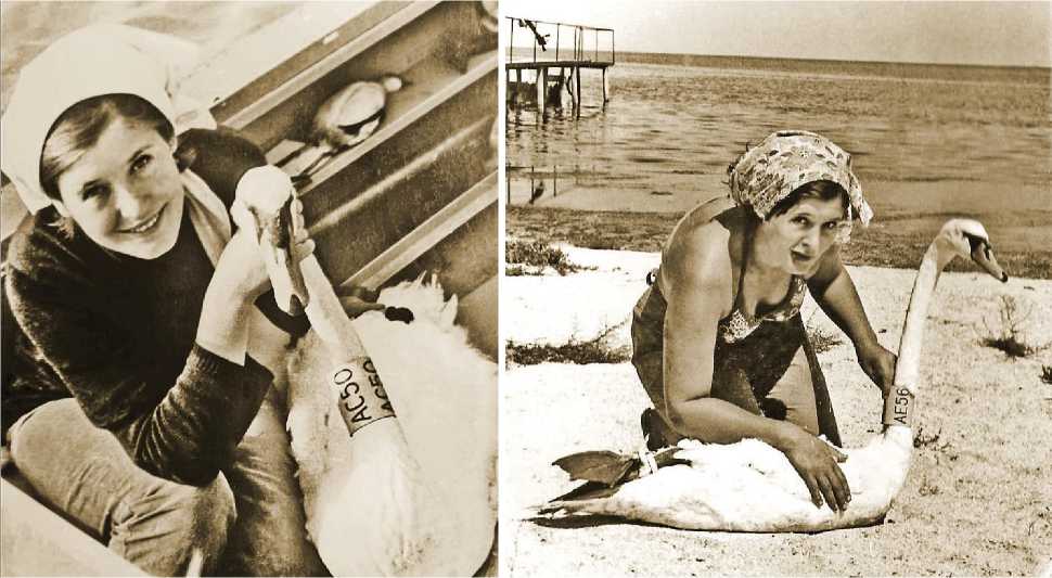 Справа – сбор параметров для заполнения учётной карточки окольцованного лебедя. Н.А.Тарина, В.В.Золотоверх, А.Б.Гринченко, А.А.Бакова. Лебяжьи острова. 1975 год. Фото предоставлено пресс-службой дирекции ФГБУ «Заповедный Крым»