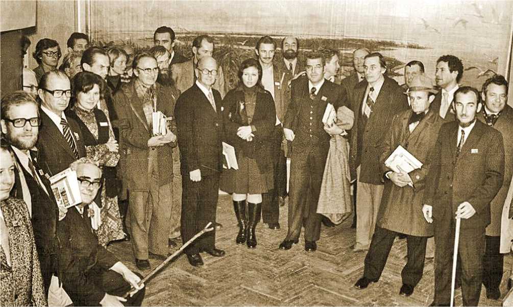 Участники и организаторы Международной орнитологической конференции в зоологическом зале Музея природы КГЗОХ им. В.В.Куйбышева. Пятая слева Н.А.Тарина, за ней директор МБИВ Джефри Мейтьюз, седьмой слева А.Тиммерман (Голландия), справа от него – сэр Питер Скотт. Первый справа Ю.В.Костин, за ним зам директора по науке КГЗОХ П.И.Шлапаков. Алушта, 1976 год