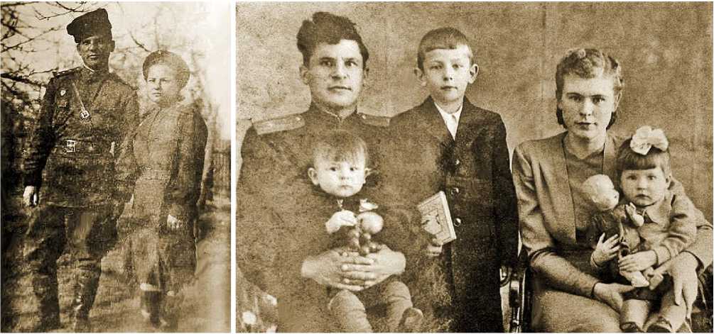 Справа – гвардии майор МГБ А.Н.Тарин, у него на руках младший сын Костя, в центре сын от первого брака Владимир, справа вторая жена Валентина Ивановна, у неё на руках – дочь Наташа. 1954 год