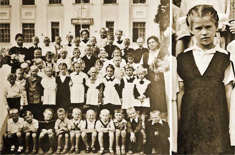 Первый класс 12-й школы Алушты. Наташа Тарина во втором ряду пятая слева, Алла Иванова (Савина) в верхнем ряду, вторая справа. На втором снимке – Наташа Тарина крупным планом.