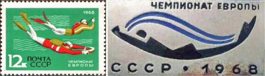 Марка Почты СССР и значок, выпущенные к Чемпионату Европы по подводному плаванию в 1968 году, проходившему в Алуште