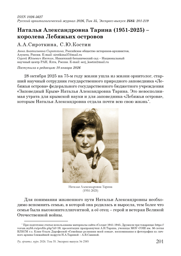 28 октября 2025 на 75-м году жизни ушла из жизни орнитолог, старший научный сотрудник государственного природного заповедника «Лебяжьи острова» федерального государственного бюджетного учреждения «Заповедный Крым» Наталья Александровна Тарина. Это невосполнимая утрата для крымской науки и для заповедника «Лебяжьи острова», которым Наталья Александровна отдала почти всю свою жизн ь* .