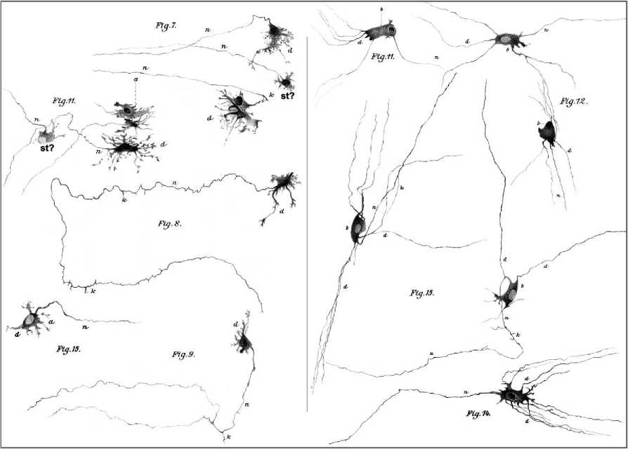 Рисунок 2. Клетки Догеля. Левая панель (figs. 7, 8, 9, 11 и 15) – нейроны человека в оригинальных рисунках Догеля, классифицированные автором как нейроны типа I. Правая панель (figs. 11, 12, 14 и 15) – нейроны человека в оригинальных рисунках Догеля, классифицированные автором как нейроны типа II: a – нейрон типа I; b – нейрон типа II; d – дендрит; k – коллатераль; n – аксон; st? (так у автора) – могут соответствовать нейронам типа I с пеньковыми (stubby) шипиками (по Догелю А.С., 1899) [1]. Из архивов кафедры гистологии, цитологии и эмбриологии КГМУ