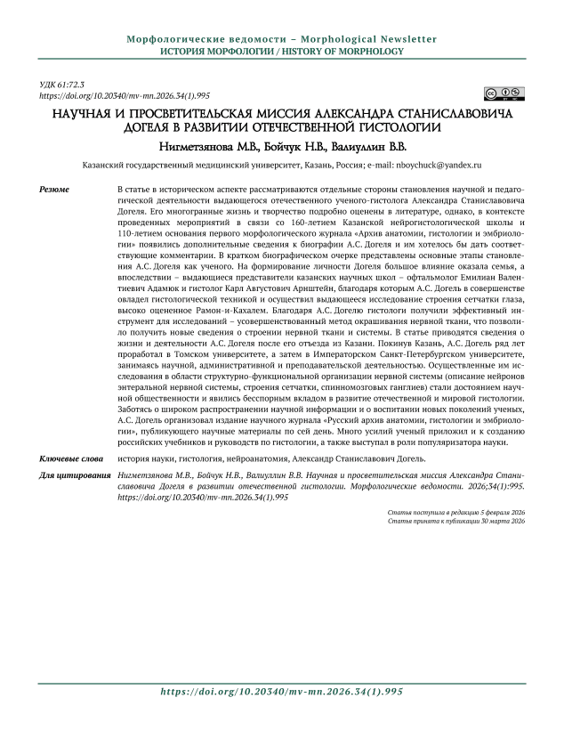 For the citation Nigmetzyanova MV, Boychuk NV, Valiullin VV. Scientific and educational mission of Alexander Stanislavovich Do- gel in the development of russian histology. Morfologicheskie Vedomosti – Morphological newsletter. 2026;34(1):995. (1).995