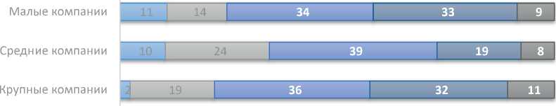 Крупные предприятия также в большей степени удовлетворены кооперацией с вузами: 43 % опрошенных указали на высокую и очень высокую значимость сотрудничества и только 2 % оценили ее как очень низкую (рис. 2). Средние компании, напротив, не слишком оптимистичны – для 24 % опрошенных ценность кооперации характеризуется как низкая, а для 39 % – как средняя.