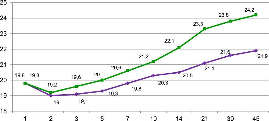 Согласно результатам, представленным на рис. 1, включение в рацион пробиотика «Битацел» способствовало более быстрой адаптации коров к изменённому рациону в связи с использованием в нем концентратной части и восстановлению уровня потребления сухого вещества. Животные опытной группы уже на третьи сутки начали опережать контрольную группу по скорости наращивания потребления, а к пятым суткам полностью восстановили исходный (до начала использования пробиотического комплекса) уровень поедаемости. В то же время в контрольной группе адаптация проходила значительно медленнее: достижение исходного уровня потребления корма было зафиксировано лишь на 7-е сутки, то есть на 2 суток позже, чем у животных, получавших пробиотик. При этом применение добавки не только ускорило адаптацию, но и в целом стимулировало потребление корма: к завершению эксперимента коровы опытной группы стабильно превосходили контрольных животных по среднесуточному потреблению сухого вещества на 2,3%.