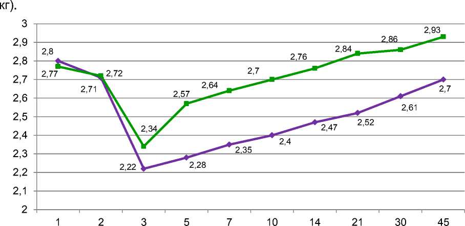 Результаты исследований и обсуждения. Использование в кормлении коров в период ранней лактации пробиотической добавки «Битацел» способствовало более быстрой стабилизации потребления кормовой смеси (рисунок 1).