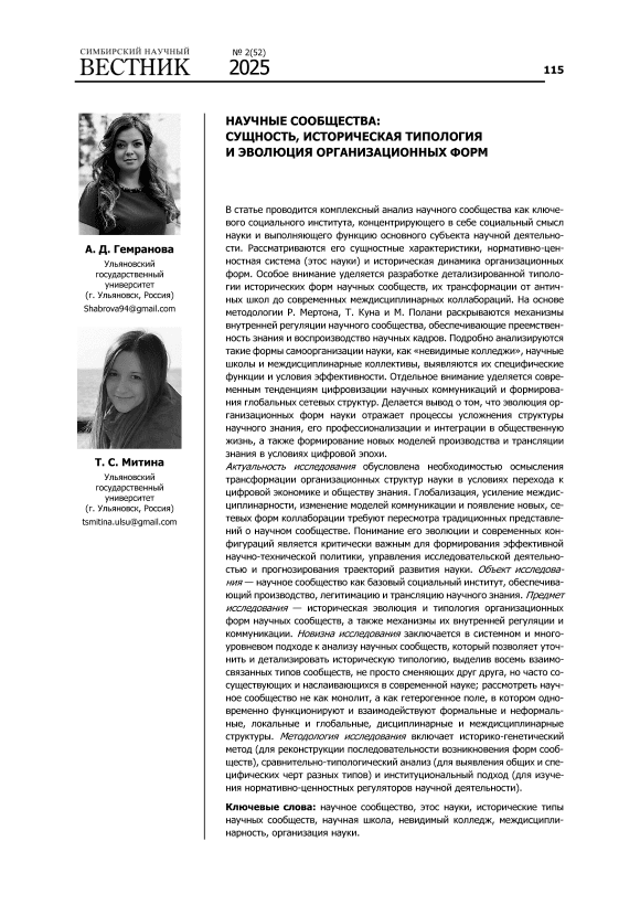 В статье проводится комплексный анализ научного сообщества как ключевого социального института, концентрирующего в себе социальный смысл науки и выполняющего функцию основного субъекта научной деятельности. Рассматриваются его сущностные характеристики, нормативно-ценностная система (этос науки) и историческая динамика организационных форм. Особое внимание уделяется разработке детализированной типологии исторических форм научных сообществ, их трансформации от античных школ до современных междисциплинарных коллабораций. На основе методологии Р. Мертона, Т. Куна и М. Полани раскрываются механизмы внутренней регуляции научного сообщества, обеспечивающие преемственность знания и воспроизводство научных кадров. Подробно анализируются такие формы самоорганизации науки, как «невидимые колледжи», научные школы и междисциплинарные коллективы, выявляются их специфические функции и условия эффективности. Отдельное внимание уделяется современным тенденциям цифровизации научных коммуникаций и формирования глобальных сетевых структур. Делается вывод о том, что эволюция организационных форм науки отражает процессы усложнения структуры научного знания, его профессионализации и интеграции в общественную жизнь, а также формирование новых моделей производства и трансляции знания в условиях цифровой эпохи. Актуальность исследования обусловлена необходимостью осмысления трансформации организационных структур науки в условиях перехода к цифровой экономике и обществу знания. Глобализация, усиление междисциплинарности, изменение моделей коммуникации и появление новых, сетевых форм коллаборации требуют пересмотра традиционных представлений о научном сообществе. Понимание его эволюции и современных конфигураций является критически важным для формирования эффективной научно-технической политики, управления исследовательской деятельностью и прогнозирования траекторий развития науки. Объект исследования — научное сообщество как базовый социальный институт, обеспечивающий производство, легитимацию и трансляцию научного знания. Предмет исследования — историческая эволюция и типология организационных форм научных сообществ, а также механизмы их внутренней регуляции и коммуникации. Новизна исследования заключается в системном и многоуровневом подходе к анализу научных сообществ, который позволяет уточнить и детализировать историческую типологию, выделив восемь взаимосвязанных типов сообществ, не просто сменяющих друг друга, но часто сосуществующих и наслаивающихся в современной науке; рассмотреть научное сообщество не как монолит, а как гетерогенное поле, в котором одновременно функционируют и взаимодействуют формальные и неформальные, локальные и глобальные, дисциплинарные и междисциплинарные структуры. Методология исследования включает историко-генетический метод (для реконструкции последовательности возникновения форм сообществ), сравнительно-типологический анализ (для выявления общих и специфических черт разных типов) и институциональный подход (для изучения нормативно-ценностных регуляторов научной деятельности).