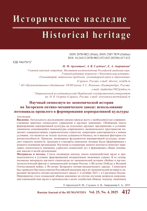Введение. Актуальность исследования связана прежде всего с необходимостью совершенствования практики социального управления в крупных компаниях. Обобщение опыта формирования корпоративной культуры на отдельных крупных предприятиях в условиях динамично изменяющейся конъюнктуры современного экономического пространства позволяет совершенствовать управленческие стратегии, оперативно адаптироваться к новым условиям, что является не только залогом успешности бизнеса, но и важным фактором его жизнеспособности. Прошлое, являющееся фундаментом корпоративной культуры, позволяет отразить ценности, традиции и стандарты поведения, которые были сформированы с момента основания организации. Изучение и сохранение данного контекста помогает передавать идентичность компании, укреплять командный дух и формировать общее понимание миссии и целей организации. Материалы и методы. Статья посвящена анализу опыта взаимодействия науки и промышленности в условиях форсированной модернизации экономики страны. В ее основу положены материалы научного симпозиума по экономической истории «Войны и научно-технологический фактор в экономической истории России: к 80-летию Победы в Великой Отечественной войне; к 90-летию Загорского оптико-механического завода». Симпозиум был проведен Научным советом Российской академии наук по экономической истории и дирекцией Загорского оптико-механического завода 3–4 октября 2025 г. в Сергиевом Посаде. Мероприятие стало площадкой обмена мнениями по итогам изучения вопросов координации взаимодействия науки и производства в целях содействия общему подъему экономики страны и в интересах укрепления ее обороноспособности. В исследовании использовались как специальные, так и общенаучные методы анализа. Традиционные принципы историзма, объективности, системности позволили полно, комплексно и глубоко рассмотреть изуча-емую тему. Обсуждение и заключение. Научный симпозиум по экономической истории на Загорском оптико-механическом заводе сыграл важную роль в актуализации проблем формирования корпоративной культуры. Проведение подобных конференций необходимо, так как современные тенденции экономического развития, происходящие социокультурные изменения, а также новые веяния в отечественной исторической науке требуют активизации и консолидации деятельности ученых, предпринимателей, общественных и политических лидеров в области изучения и сохранения исторического прошлого как фундамента общественного сознания россиян.