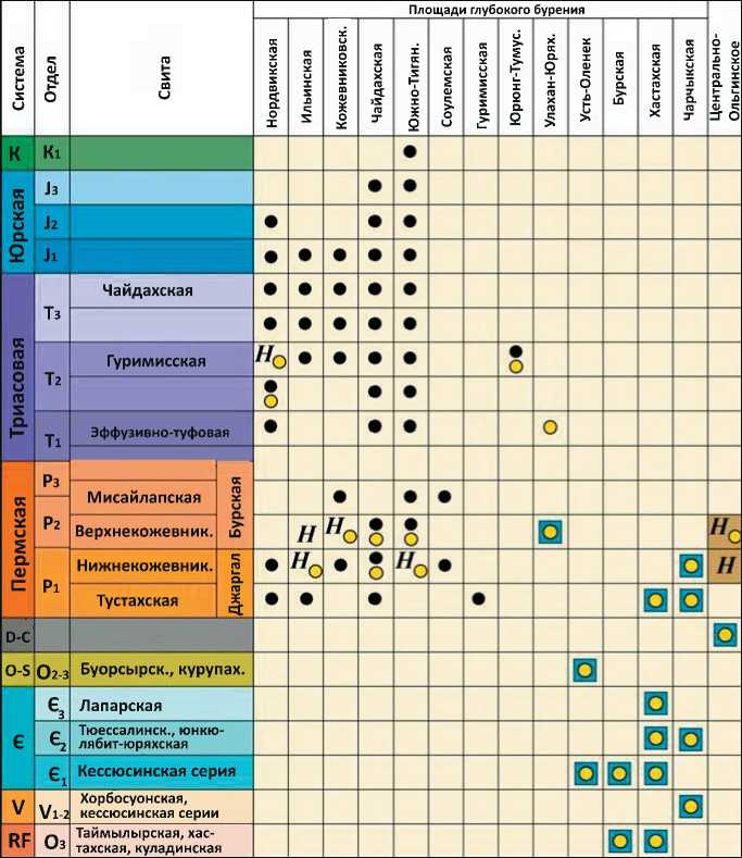 Рис. 5. Распределение залежей и нефтегазопроявлений на площадях глубокого бурения в разрезе Анабаро-Хатангской и Лено-Анабарской НГО (по данным СНИИГГиМС, 2024) [28]