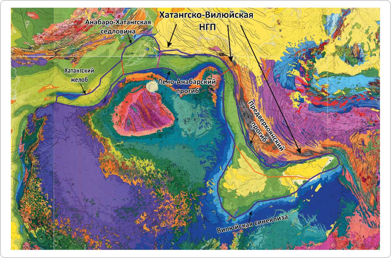 Рис. 1. Местоположение крупнейших тектонических элементов Хатангско-Вилюйской НГП на Геологической карте Сибирской платформы (по данным НПЦ «Геостра», 2025)