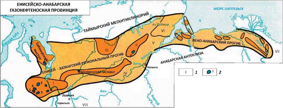 1 — тектонические элементы (I — Танамско-Малохетский мегавал, II — Балахнинский мегавал, III — Янгодо-Грбитский выступ, IV — Дудыптинско-Боганидский прогиб, V — Жданихинский прогиб, VI — Анабаро-Хатангская седловина, VII — Верхоянский антиклинорий, VIII — Курейская синеклиза); 2 — местрождения (1 — Дерябинское, 2 — Пеляткинское, 3 — Мессоях-ское, 4 — Северо-Соленинское, 5 — Южно-Соленинское, 6 — Балахнинское)