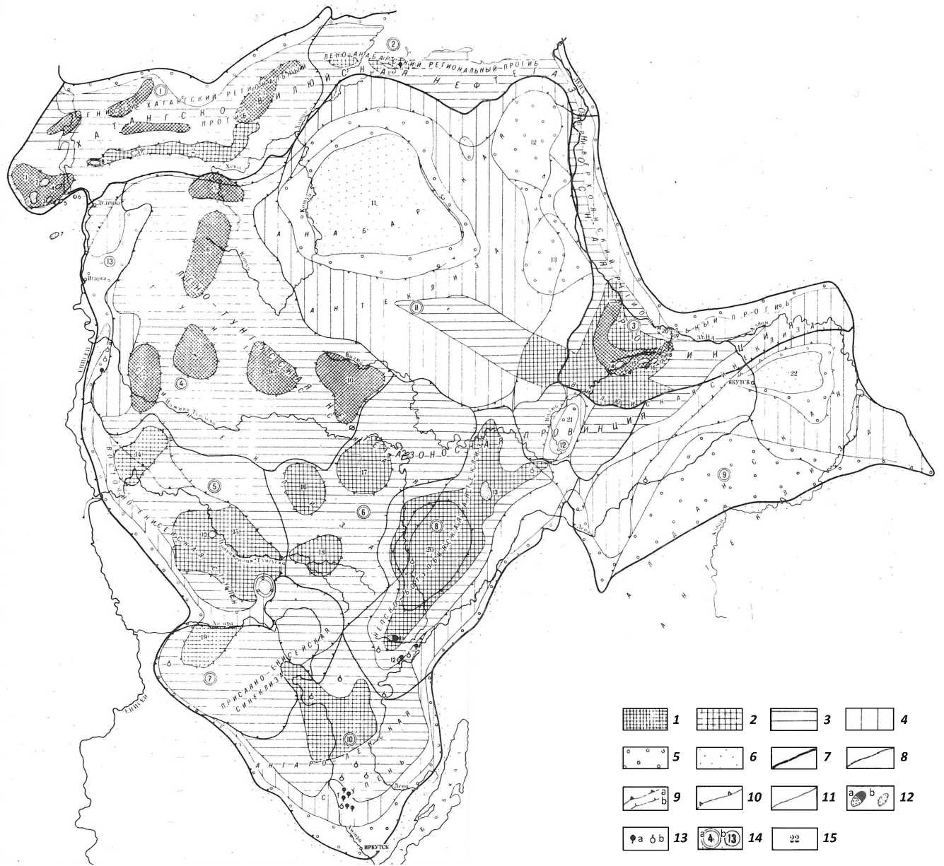 1 – 5 — земли различных перспектив нефтегазоносности; 6 — бесперспективные территории; границы ( 7 – 11 ): 7 - нефтегазоносных провинций, 8 — НГО и самостоятельных НГР, 9 — крупнейших структурных элементов осадочного чехла (a), крупнейших структурных элементов по подошве палеозоя, перекрытых мезозойскими образованиями (b), 10 — основных крупных (I порядка) положительных структур, 11 — зон с различной плотностью запасов УВ; 12 - месторождения (а — нефтегазовые, b — газовые и газоконденсатные): 1 — Соленинское, 2 — Пе-ляткинское, 3 — Мессояхское, 4 — Казанцевское, 5 — Зимнее, 6 — Нижнехетское, 7 — Сузунское, 8 — Озерное, 9 — Джангодское, 10 — Куюмбинское, 11 — Ярактинское, 12 — Марковское, 13 — Среднеботуобинское, 14 — Средневилюйское, 15 — Мастахское, 16 — Соболохское, 17 — Неджелинское, 18 — Бадаранское, 19 — Усть-Ви-люйское, 20 — Собо-Хаинское; 13 — промышленные притоки в единичных скважинах (a — нефти, b — газа); 14 — НГО (а) и самостоятельные НГР (b). Хатангско-Вилюйская НГП . НГО : 1 — Енисей-Хатангская, 2 — Лено-Ана-барская, 3 — Лено-Вилюйская. Лено-Тунгусская НГП . НГО : 4 — Северо-Тунгусская, 5 — Южно-Тунгусская, 6 — Катангская, 7 — Присаяно-Енисейская, 8 — Непско-Ботуобинская, 9 — Северо-Алданская, 10 — Ангаро-Ленская, 11 — Анабарская. Самостоятельные НГР : 12 — Западно-Вилюйская, 13 — Турухано-Норильский; 15 — основные крупные положительные структуры: 1 — Танамский свод, мегавалы: 2 — Рассохинский, 3 — Балахнинский, 4 — Хапчагай-ский, своды: 5 — Ледянский, 6 — Аянский, 7 — Сурингдаконский, 8 — Юктелийский, 9 — Кочечумский, 10 — Турунский, 11 — Анабарский, 12 — Оленекский, 13 — Мунский, 14 — Бахтинский, 15 — Камовский, 16 — Чуньский, 17 — Илимпей-ский, 18 — Ванаварский, 19 — Богучано-Манзинский выступ, 20 — Непский свод, 21 — Сунтарский свод, 22 — Якутский свод
