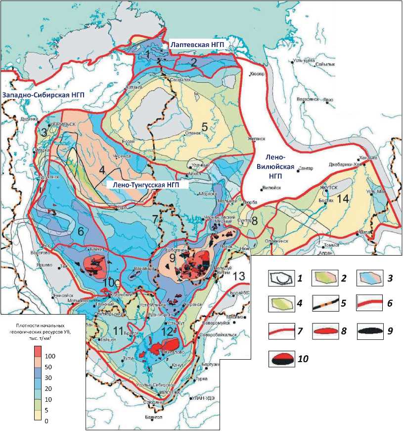 НГО Лено-Тунгусской НГП: 1 — Анабаро-Хатангская, 2 — Лено-Анабарская, 3 — Турухано-Норильская, 4 — Северо-Тунгусская, 5 — Анабарская, 6 — Южно-Тунгусская, 7 — Центрально-Тунгусская, 8 — Западно-Вилюйская, 9 — Непско-Ботуобинская, 10 — Байкитская, 11 — Присаяно-Енисейская, 12 — Ангаро-Ленская, 13 — Предпатомская, 14 — Северо-Алданская