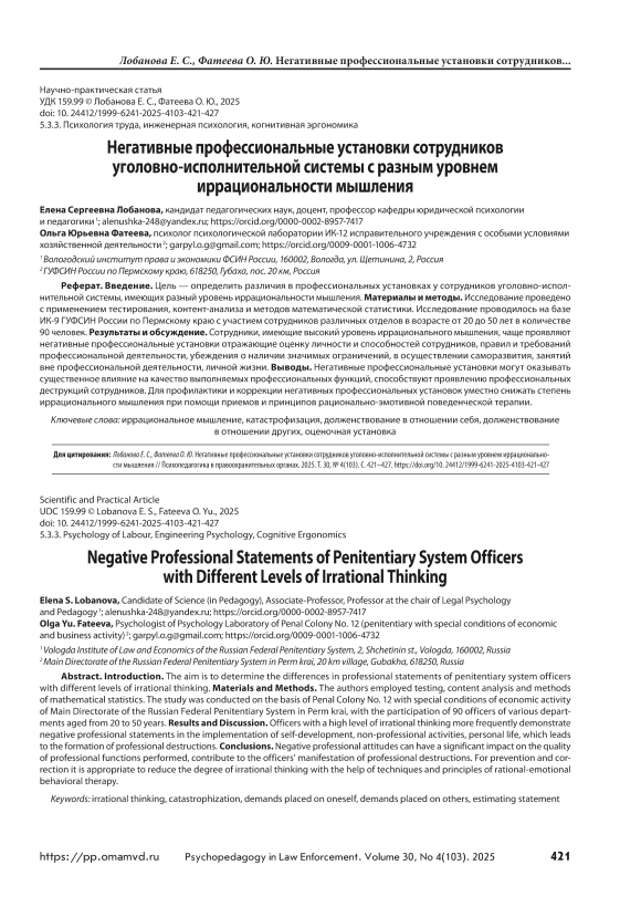 Введение. Цель — определить различия в профессиональных установках у сотрудников уголовно-исполнительной системы, имеющих разный уровень иррациональности мышления. Материалы и методы. Исследование проведено с применением тестирования, контент-анализа и методов математической статистики. Исследование проводилось на базе ИК-9 ГУФСИН России по Пермскому краю с участием сотрудников различных отделов в возрасте от 20 до 50 лет в количестве 90 человек. Результаты и обсуждение. Сотрудники, имеющие высокий уровень иррационального мышления, чаще проявляют негативные профессиональные установки отражающие оценку личности и способностей сотрудников, правил и требований профессиональной деятельности, убеждения о наличии значимых ограничений, в осуществлении саморазвития, занятий вне профессиональной деятельности, личной жизни. Выводы. Негативные профессиональные установки могут оказывать существенное влияние на качество выполняемых профессиональных функций, способствуют проявлению профессиональных деструкций сотрудников. Для профилактики и коррекции негативных профессиональных установок уместно снижать степень иррационального мышления при помощи приемов и принципов рационально-эмотивной поведенческой терапии.