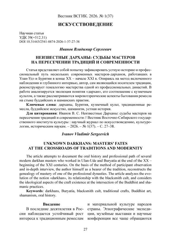 The article attempts to document the oral history and professional path of several modern darkhan masters who worked in Ulan-Ude and Buryatia at the end of the XX – beginning of the XXI centuries. On the basis of the method of participant observation and in-depth interview, the author himself as a bearer of the tradition, reconstructs the genealogy of mastery of one of the professional dynasties. The article analyzes the evolution of the notion «darkhan», its relationship with the blacksmith cult, and сonsiders the ideological aspects of the craft existence at the intersection of the Buddhist and shamanic practices.
