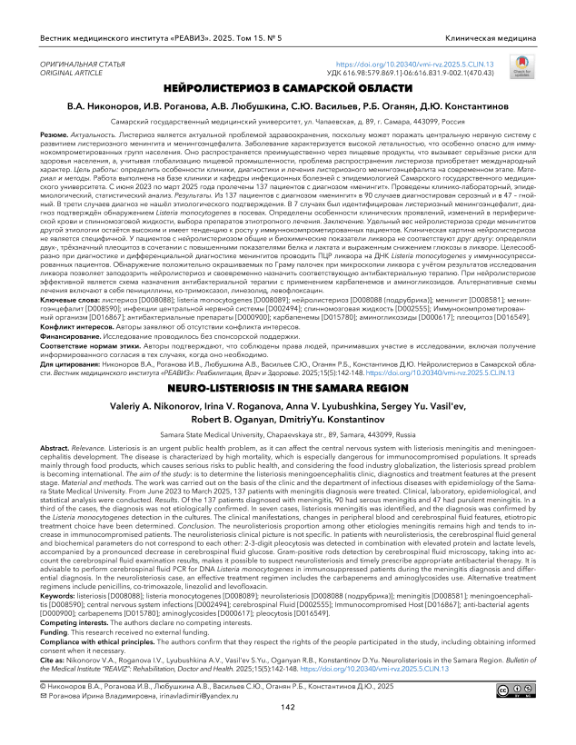 Актуальность. Листериоз является актуальной проблемой здравоохранения, поскольку может поражать центральную нервную систему с развитием листериозного менингита и менингоэнцефалита. Заболевание характеризуется высокой летальностью, что особенно опасно для иммунокомпрометированных групп населения. Оно распространяется преимущественно через пищевые продукты, что вызывает серьёзные риски для здоровья населения, а, учитывая глобализацию пищевой промышленности, проблема распространения листериоза приобретает международный характер. Цель работы: определить особенности клиники, диагностики и лечения листериозного менингоэнцефалита на современном этапе. Материал и методы. Работа выполнена на базе клиники и кафедры инфекционных болезней с эпидемиологией Самарского государственного медицинского университета. С июня 2023 по март 2025 года пролечены 137 пациентов с диагнозом «менингит». Проведены клинико-лабораторный, эпидемиологический, статистический анализ. Результаты. Из 137 пациентов с диагнозом «менингит» в 90 случаев диагностирован серозный и в 47 – гнойный. В трети случаев диагноз не нашёл этиологического подтверждения. В 7 случаях был идентифицирован листериозный менингоэнцефалит, диагноз подтверждён обнаружением Listeria monocytogenes в посевах. Определены особенности клинических проявлений, изменений в периферической крови и спинномозговой жидкости, выбора препаратов этиотропного лечения. Заключение. Удельный вес нейролистериоза среди менингитов другой этиологии остаётся высоким и имеет тенденцию к росту у иммуннокомпрометированных пациентов. Клиническая картина нейролистериоза не является специфичной. У пациентов с нейролистериозом общие и биохимические показатели ликвора не соответствуют друг другу: определяли двух-, трёхзначный плеоцитоз в сочетании с повышенными показателями белка и лактата и выраженным снижением глюкозы в ликворе. Целесообразно при диагностике и дифференциальной диагностике менингитов проводить ПЦР ликвора на ДНК Listeria monocytogenes у иммунносупрессированных пациентов. Обнаружение положительно окрашиваемых по Граму палочек при микроскопии ликвора с учётом результатов исследования ликвора позволяет заподозрить нейролистериоз и своевременно назначить соответствующую антибактериальную терапию. При нейролистериозе эффективной является схема назначения антибактериальной терапии с применением карбапенемов и аминогликозидов. Альтернативные схемы лечения включают в себя пенициллины, ко-тримоксазол, линезолид, левофлоксацин.