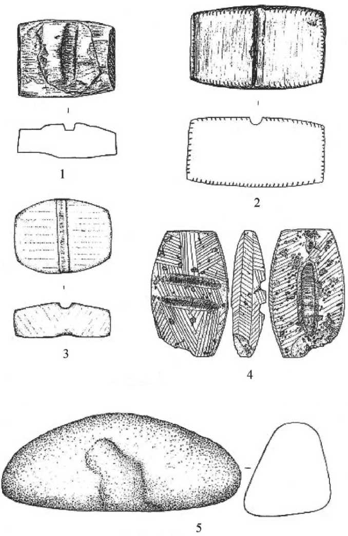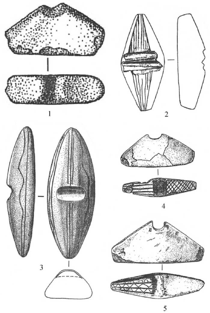 тип неолитических «утюжков» представлен глиняными изделиями Кокшаровского холма. Основным их признаком являются скругленные (без углов) очертания (рис. 3, 1–4 ). К ним примыкает и тальковый «утюжок» из клада на Шайтанском озере (рис. 1, 5 ).