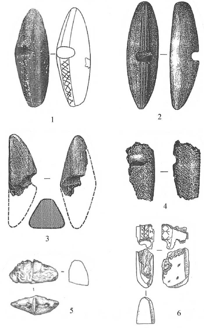 Два обломка орнаментированного «утюжка» из талька находились в жилищном комплексе неолитического поселения Евстюниха I. Сохранившийся конец «утюжка» имеет длину 5,9 см, ширину. 2,8 см и высоту 3,9 см (рис. 3, 6 ). Второй фрагмент «утюжка» с желоб-