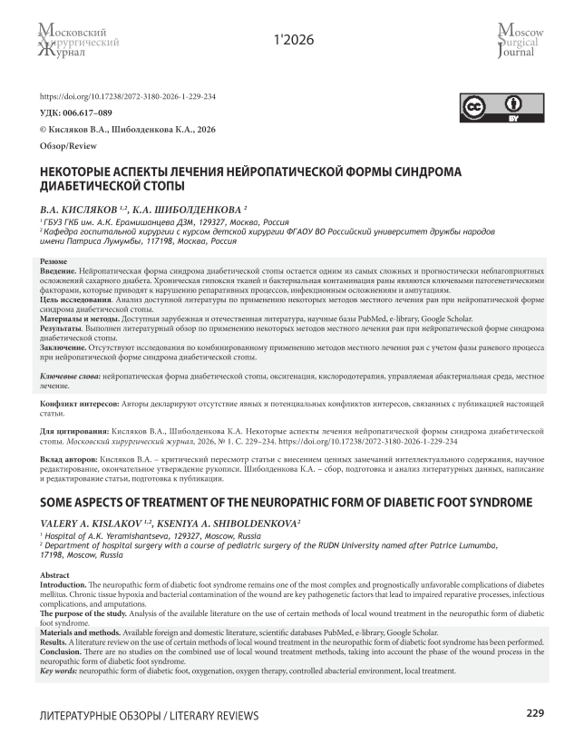 Введение. Нейропатическая форма синдрома диабетической стопы остается одним из самых сложных и прогностически неблагоприятных осложнений сахарного диабета. Хроническая гипоксия тканей и бактериальная контаминация раны являются ключевыми патогенетическими факторами, которые приводят к нарушению репаративных процессов, инфекционным осложнениям и ампутациям. Цель исследования. Анализ доступной литературы по применению некоторых методов местного лечения ран при нейропатической форме синдрома диабетической стопы. Материалы и методы. Доступная зарубежная и отечественная литература, научные базы PubMed, e-library, Google Scholar. Результаты. Выполнен литературный обзор по применению некоторых методов местного лечения ран при нейропатической форме синдрома диабетической стопы. Заключение. Отсутствуют исследования по комбинированному применению методов местного лечения ран с учетом фазы раневого процесса при нейропатической форме синдрома диабетической стопы.