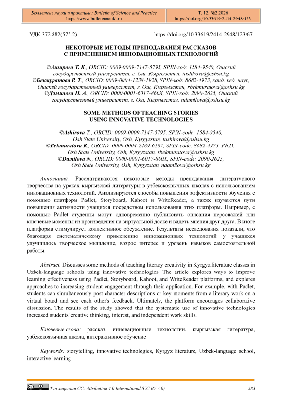 Рассматриваются некоторые методы преподавания литературного творчества на уроках кыргызской литературы в узбекскоязычных школах с использованием инновационных технологий. Анализируются способы повышения эффективности обучения с помощью платформ Padlet, Storyboard, Kahoot и WriteReader, а также изучаются пути повышения активности учащихся посредством использования этих платформ. Например, с помощью Padlet студенты могут одновременно публиковать описания персонажей или ключевые моменты из произведения на виртуальной доске и видеть мнения друг друга. В итоге платформа стимулирует коллективное обсуждение. Результаты исследования показали, что благодаря систематическому применению инновационных технологий у учащихся улучшилось творческое мышление, возрос интерес и уровень навыков самостоятельной работы.