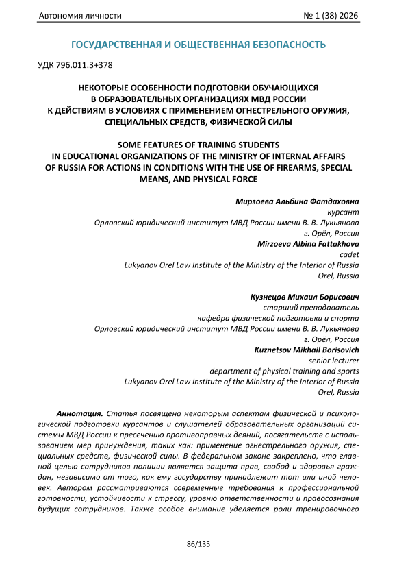 Статья посвящена некоторым аспектам физической и психологической подготовки курсантов и слушателей образовательных организаций системы МВД России к пресечению противоправных деяний, посягательств с использованием мер принуждения, таких как: применение огнестрельного оружия, специальных средств, физической силы. В федеральном законе закреплено, что главной целью сотрудников полиции является защита прав, свобод и здоровья граждан, независимо от того, как ему государству принадлежит тот или иной человек. Автором рассматриваются современные требования к профессиональной готовности, устойчивости к стрессу, уровню ответственности и правосознания будущих сотрудников. Также особое внимание уделяется роли тренировочного процесса, а также междисциплинарного подхода и формирования навыков законного применения силы. Это в свою очередь, позволяет повысить эффективность служебной деятельности и обеспечить соблюдение законности при выполнении служебных задач, в условиях повышенной ответственности, стоящей перед сотрудниками полиции.