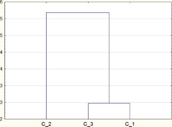 Рисунок - Дендрограмма результатов кластерного анализа для трёх наблюдений (Метод одиночной связи. Евклидово расстояние): С_1 - чистопородные свиноматки полтавской мясной породы (ПМ); С_2 - свиноматки, полученных методом вводного скрещивания с использованием 12,5% доли крови финского ландраса (ПМ/ФЛ); С_3 - свиноматки, полученных методом вводного скрещивания с использованием 12,5% доли крови скороспелой мясной породы