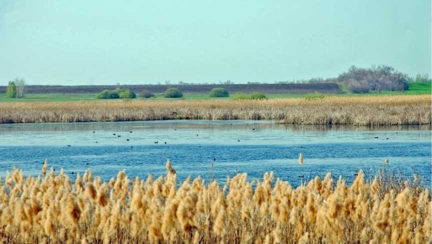 шая белая цапля Casmerodius albus , серый гусь Anser anser , широконоска Spatula clypeata , серая утка Mareca strepera , водяной пастушок Rallus aquaticus , вяхирь Columba palumbus и соловьиный сверчок Locustella luscinioides . На том же самом участке, что и в 2024 году (Гудина 2025) вновь нашли пару кавказских черноголовых чеканов Saxicola (torquata) variegata . На озере Подовое отметили 4 огарей Tadorna ferruginea , резко увеличилась численность большой белой цапли и скворца (табл. 1).