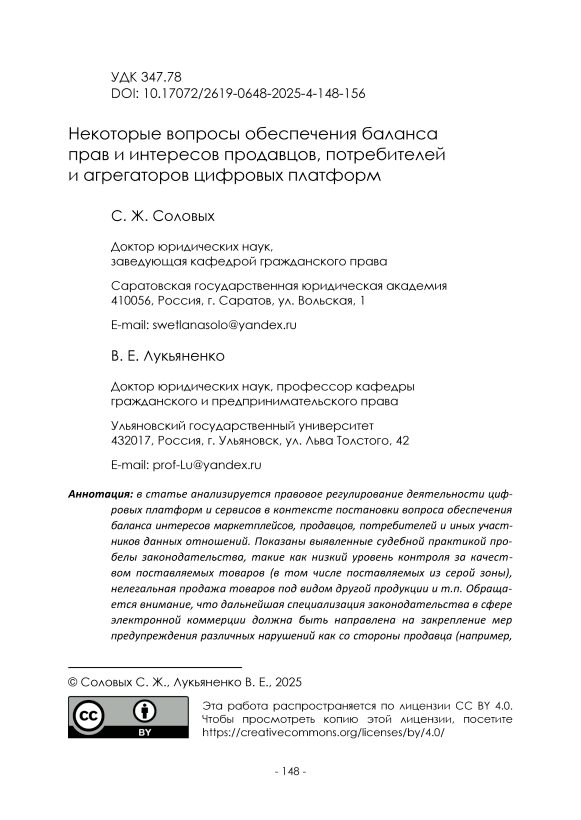 Некоторые вопросы обеспечения баланса прав и интересов продавцов, потребителей и агрегаторов цифровых платформ