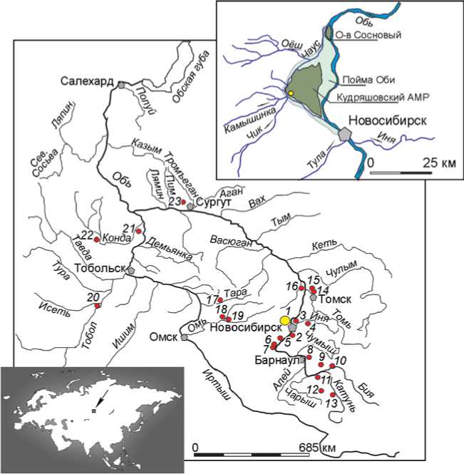 1 – Крохалевка-5; 2 – Завьялово-2, -8; 3 – Седова Заимка-2; 4 – Заречное-1; 5 – Ордынское-1е; 6 – Усть-Алеус-4; 7 – Крутиха-5; 8 – Фирсово XI; 9 – Большой Мыс; 10 – Малоуг-ренево; 11 – Цыганкова Сопка IV; 12 – Каминная пещера; 13 – Нижнетыткескенская пещера; 14 – Томский могильник на Большом мысе и Старое Мусульманское Кладбище; 15 – Самусьский могильник; 16 – Иштанский могильник; 17 – Протока; 18 – Венгерово-2А; 19 – Сопка-2/1; 20 – Бузан-3; 21 – Чилимка V; 22 – Леуши XIV; 23 – Быстрый Кульёган-66.