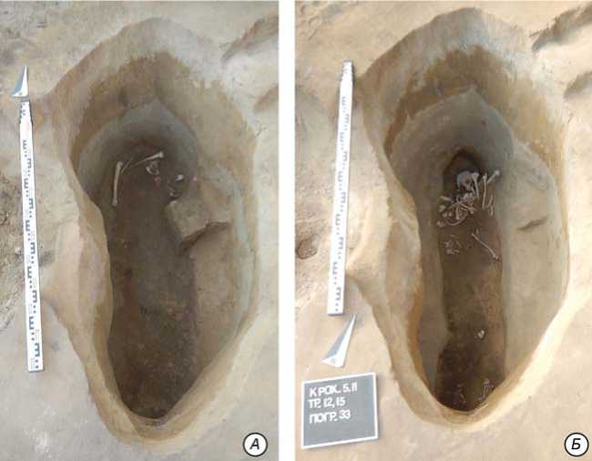 Рис. 2. Погребение 33 на уровне горизонтов 6 ( А ) и 7 ( Б ).