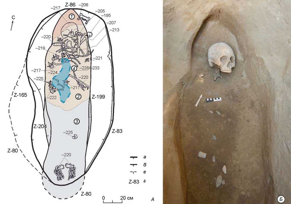 цессе исследования стало очевидно, что желтая супесь вмещающего слоя почти идентична заполнению верхних горизонтов могилы, это обусловило размытость ее границ. В разрезе зафиксированы следы смещения естественных рыхлых отложений (прослойки песка и алеврита) в средней пачке грунта, заполнявшего яму, по направлению склона террасы, за счет чего западная стенка ямы приобрела отрицательный наклон (рис. 3, А ). В средней части заполнения южной половины могилы встречены небольшие углистые пятна и фрагменты сгоревшей древесины.
