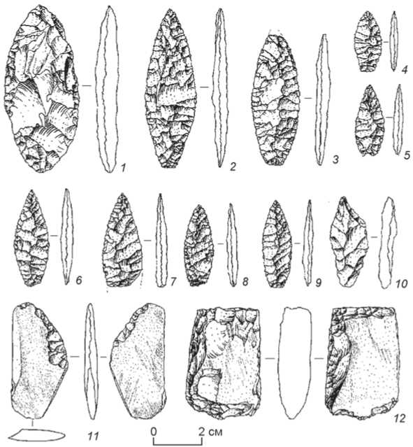 1 – бифас; 2 – 9 – наконечники; 10 – проколка; 11 – нож; 12 – тесло.