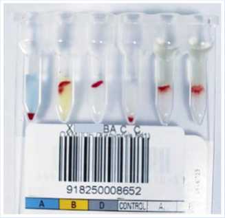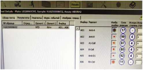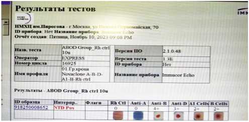 Скрининг нерегулярных антител с трёхклеточной панелью тест-эри-троцитов (Рис. 4) и прямой антигло-булиновый тест дали отрицательные результаты.