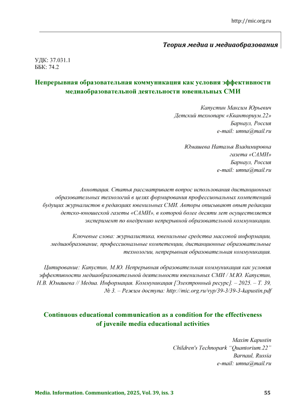Citation: Kapustin M., Yumasheva N.V. Continuous educational communication as a condition for the effectiveness of juvenile media educational activities. Media. Information. Communication [Electronic resource], 2025, vol. 39(3). URL: