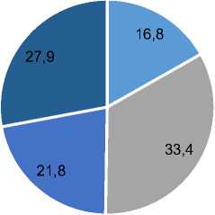 Следующий вопрос заключался в выборе направления обучения. 33,4 % сельских педагога обозначили в качестве желаемого социально-гуманитарное направление (русский язык и литература, история, обществознание) – 291 (33,4 %), начальное образование – 243 (27,9 %), информационно-математическое направление – 190 (21,8 %), естественно-научное образование (биология, химия, физика, география) – 146 (16,8 %) учителей (рис. 2).