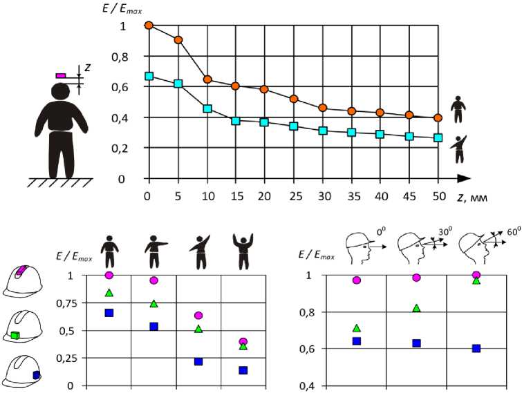 Рис. 3. Зависимость напряженности электрического поля от расстояния до головы, от положения рук, головы, при различных вариантах установки датчика на каске