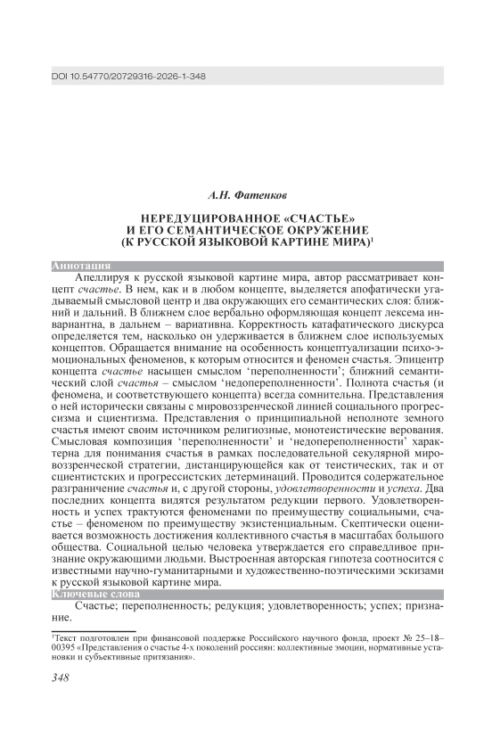 Appealing to the Russian linguistic worldview, the author examines the concept of happiness. As with any other concept, it has an apophatically identified semantic center and two semantic layers surrounding it: near and far. In the near layer, the lexeme verbalizing the concept is invariable, while in the far layer, it can vary. Evaluating the correctness of the cataphatic discourse here requires considering how well it is retained within the near layer of the concepts used. The author also focuses on the specific approach to conceptualizing psycho-emotional phenomena, including happiness. The epicenter of the happiness concept is filled with the meaning of ‘overfullness’, and the near semantic layer of happiness with the meaning of ‘underoverfullness’. The fullness of happiness, both as a phenomenon and a concept, is always questionable. The ideas around it are historically associated with the worldviews of social progressivism and scientism. Views of the fundamental non-fullness of earthly happiness originate from monotheistic religious beliefs. The semantic composition of ‘overfullness’ and ‘underoverfullness’ is inherent to the perception of happiness within a consistent secular worldview strategy that distances itself from theistic, scientific and progressive determinations. A substantial distinction is made between happiness, on the one hand, and satisfaction and success, on the other. The latter two are viewed as results of reducing the former. Satisfaction and success are primarily interpreted as social phenomena, while happiness is mainly existential. The idea that collective happiness is possible at a large society level is met with skepticism. A person’s social goal is believed to be their fair recognition by those around them. The hypothesis developed by the author aligns with the wellknown scientific-humanitarian and artistic-poetic sketches of the Russian linguistic worldview.