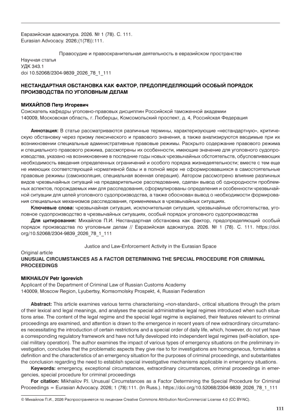 This article examines various terms characterising «non-standard», critical situations through the prism of their lexical and legal meanings, and analyses the special administrative legal regimes introduced when such situations arise. The content of the legal regime and the special legal regime is explained, their features relevant to criminal proceedings are examined, and attention is drawn to the emergence in recent years of new extraordinary circumstances necessitating the introduction of certain restrictions and a special order of daily life, which, however, do not yet have a corresponding regulatory framework and have not fully developed into independent legal regimes (self-isolation, special military operation). The author examines the impact of various types of emergency situations on the preliminary investigation, concludes that the problematic aspects they give rise to for investigations are homogeneous, formulates a definition and the characteristics of an emergency situation for the purposes of criminal proceedings, and substantiates the conclusion regarding the need to establish special investigative mechanisms applicable in emergency situations.