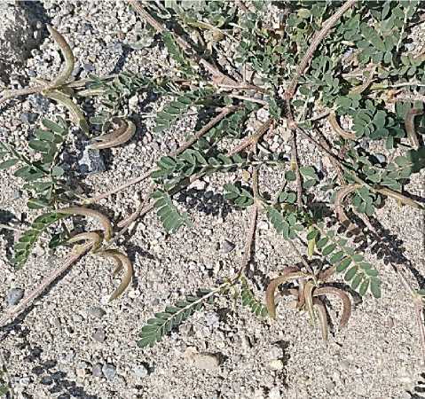 Etymology: Astragalus derives from the Greek name of the ankle bone, referring to plants with knotted, spine-like roots; hamosus refers to the strongly curved pods resembling a hook.