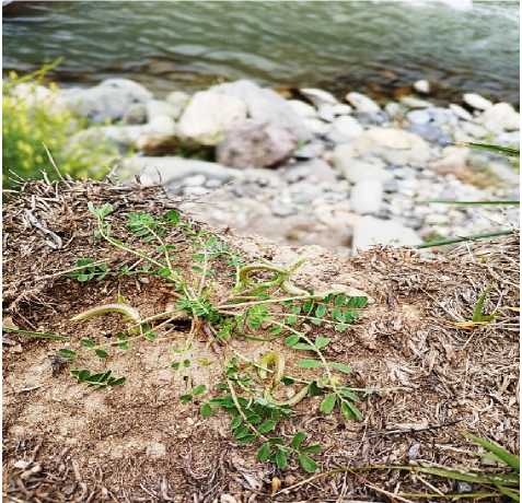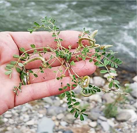 Botanical description: Stem up to 60 cm; leaves 5–10 cm long; leaflets 9–11 pairs, oblong, obtuse or truncate; lower surface pubescent, upper surface glabrous. Inflorescence with 5–14 flowers. Calyx 5–6 mm. Corolla white or pale yellow; standard 7–8 mm; stamens 10. Pods 20–50 mm long and 2–3 mm wide, linear, apex acute, nearly semicircularly curved, laterally compressed.