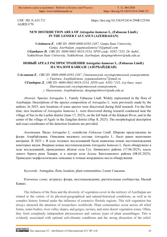 Текст научной статьи New Distribution Area of Astragalus hamosus L. (Fabaceae Lindl.) in the Lesser Caucasus (Azerbaijan)