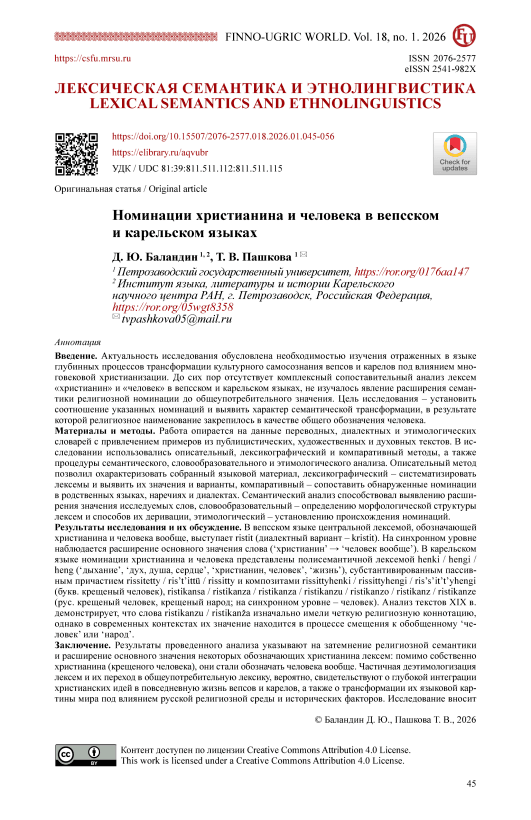 Introduction. The relevance of this research stems from the need to examine the underlying processes of transformation in the cultural identity of the Vepsians and Karelians under the influence of centuries of Christianization, as reflected in their languages. So far, no detailed comparison has been made of the words for “Christian” and “human” in the Vepsian and Karelian languages. In addition, researchers have not yet studied how a religious word can take on a broader, everyday meaning over time. The aim of this research is to establish the relationship between these terms and to identify the nature of the semantic transformation that resulted in a religious designation becoming the standard term for a human being. Materials and Methods. This study draws on data from translation, dialectal, and etymological dictionaries, incorporating examples from journalistic, literary, and spiritual texts. The research employs descriptive, lexicographic, and comparative methods, along with procedures of semantic, derivational, and etymological analysis. The descriptive method made it possible to characterize the collected linguistic material; the lexicographic method enabled the systematization of lexemes and the identification of their meanings and variants; and the comparative method facilitated the comparison of the identified nominations across related languages, vernaculars, and dialects. Semantic analysis contributed to revealing the semantic expansion of the words under study, derivational analysis helped determine the morphological structure of the lexemes and their modes of derivation, and etymological analysis established the origin of the nominations. Results and Discussion. In the Vepsian language, the central lexeme denoting both a Christian and a human being in general is ristit (with the dialectal variant kristit). At the synchronic level, a semantic broadening can be observed, moving from the core meaning of ‘Christian’ towards the generalized sense of ‘human being’. In the Karelian language, the concepts of Christian and human are represented by several linguistic forms. These include the polysemantic lexeme henki / hengi / heng (encompassing the meanings ‘breath’, ‘spirit, soul, heart’, ‘Christian, human’, and ‘life’), the substantivized passive participle rissitetty / ris’t’ittü / rissitty, and the compounds rissittyhenki / rissittyhengi / ris’s’it’t’yhengi (lit. ‘baptized person’) and ristikansa / ristikanza / ristikanza / ristikanzu / ristikanzo / ristikanz / ristikanze (lit. ‘baptized person, baptized people’; at the synchronic level, simply ‘human being’). An analysis of 19th-century texts reveals that the words ristikanzu / ristikanža initially carried a distinctly religious connotation. However, in contemporary usage, their meaning is undergoing a process of semantic shift towards the generalized notions of ‘human being’ or ‘people’. Conclusions. The results of the analysis indicate a semantic bleaching of religious connotations and an expansion of the core meaning of several lexemes denoting a Christian: in addition to referring specifically to a Christian (a baptized person), they have come to denote a human being in general. The partial de-etymologization of these lexemes and their transition into common vocabulary likely attest to the profound integration of Christian ideas into the everyday life of the Vepsians and Karelians, as well as to a transformation of their linguistic worldview under the influence of the Russian religious milieu and historical factors. This study contributes to the understanding of the historical transformation and functioning of certain elements within the Karelian and Vepsian linguistic worldview. The findings may be utilized in further research on the spiritual culture of these peoples and incorporated into courses on lexicology and dialectology.