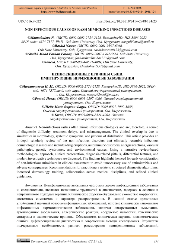 Неинфекционные высыпания часто имитируют инфекционные заболевания и, следовательно, являются источником трудностей в диагностике, задержек в лечении и неправильного подхода к терапии. Клиническое сходство обусловлено схожестью морфологии, системных симптомов и характера распространения. В данной статье представлен углубленный научный обзор неинфекционных заболеваний, которые клинически напоминают инфекционные дерматологические заболевания, включая лекарственные высыпания, аутоиммунные заболевания, аллергические реакции, сосудистые патологии, генетические синдромы и экологические причины. Обсуждаются клиническая картина, диагностические ошибки, дифференциальная диагностика и современные методы исследования. Результаты подчеркивают необходимость раннего рассмотрения неинфекционных заболеваний, имитирующих инфекционные, при клинической оценке, чтобы избежать ненужного использования противомикробных препаратов и неблагоприятных последствий. Рекомендации для практикующих врачей касаются структурированных диагностических алгоритмов, повышения квалификации дерматологов, сотрудничества между медицинскими дисциплинами и усовершенствованных клинических руководств.