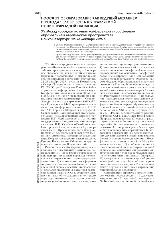Ноосферное образование как ведущий механизм перехода человечества к управляемой социоприродной эволюции. XV Международная научная конференция «Ноосферное образование в евразийском пространстве». Санкт-Петербург, 22–23 декабря 2025 г.