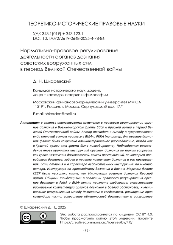 В статье анализируются изменения в правовом регулировании органов дознания в Военно-морском флоте СССР и Красной армии в период Великой Отечественной войны. Автор приходит к выводу о существовании ряда отличий в этом процессе в ВМФ и РККА (например, для органов дознания флота было сохранено административное расследование, тогда как в Красной армии эта форма была ликвидирована). Наблюдается расхождение вновь принятых инструкций органам дознания по таким вопросам, как сроки назначения дознавателей, список преступлений, по которым проводилось дознание, задачи и правила назначения дознания и его прекращения. Есть отличия и в характере ведомственных инструкций: по мнению автора, Инструкция по производству дознания в Военно-Морском флоте СССР была несколько мягче, чем Инструкция органам дознания Красной армии. Общими тенденциями в эволюции правового регулирования органов дознания в РККА и ВМФ нужно признать следующие: существенное расширение компетенции органов дознания в боевой обстановке, нивелирование разграничения между дознанием и следствием, расширение прав командира части, сокращение обязанностей дознавателя и расширение его прав и компетенции. Также наблюдается легитимизация отступлений от ряда требований ведомственных инструкций в боевой обстановке, то есть возврат к практике «упрощенчества». Происходит расширение толкования отдельных норм уголовного права.